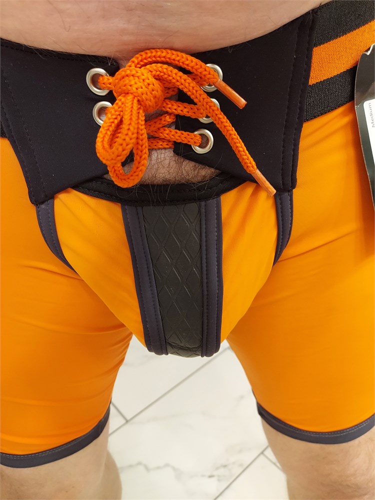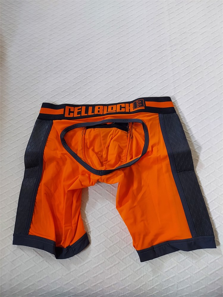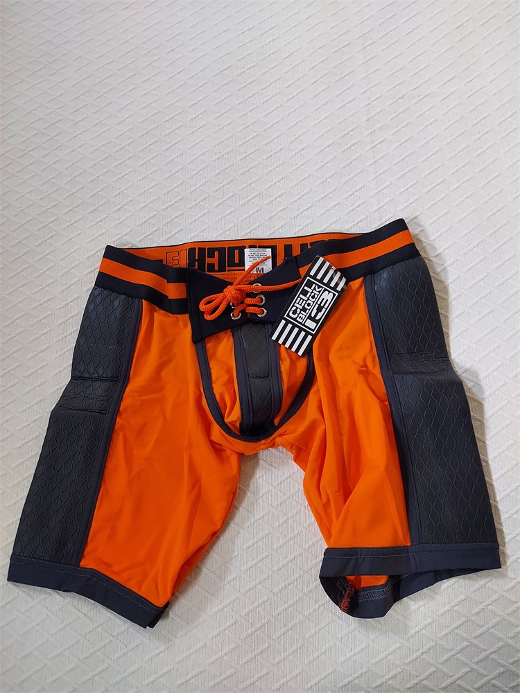 New orange and black cellblock 13 shorts with open back. Lace up front with a touch of pleather. The back is open for some fun.