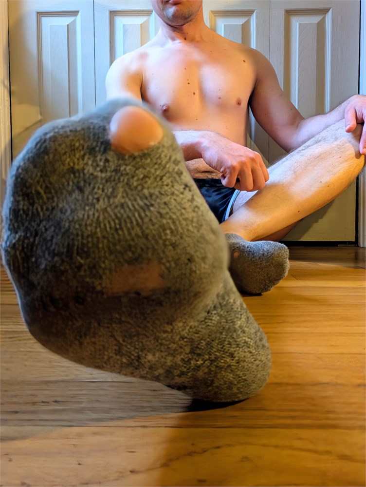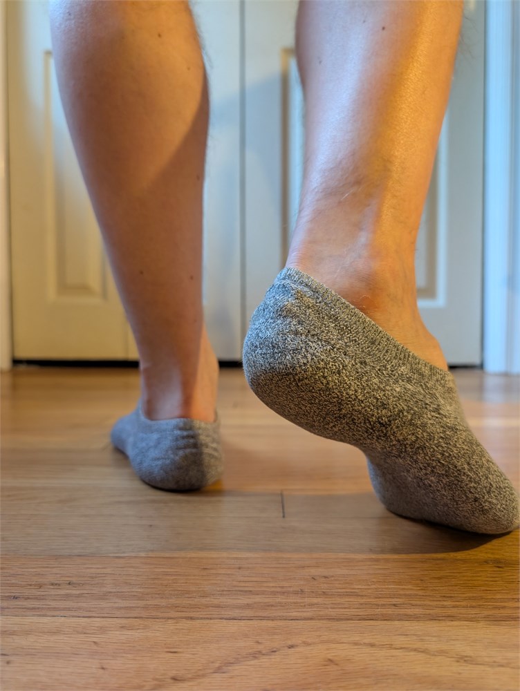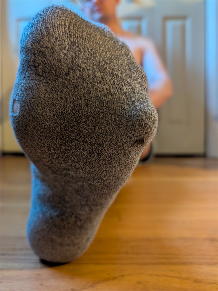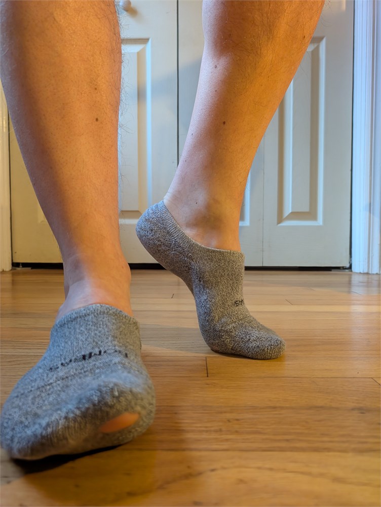 Bombas no-show gym socks in medium (US shoe size 8.5-9), heathered gray. "Enjoyed" extensively.