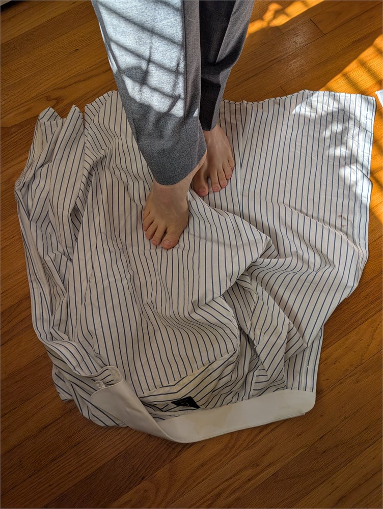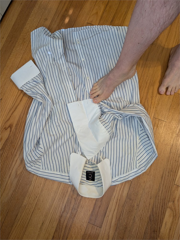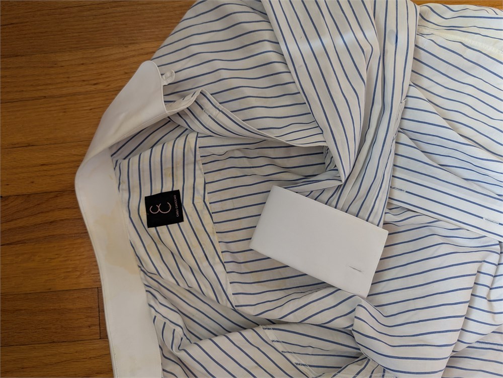 Carlo Chiocchio custom dress shirt, contrasting French cuff and tab collar, blue stripe.