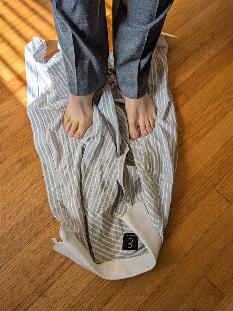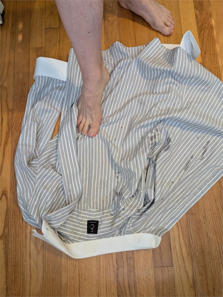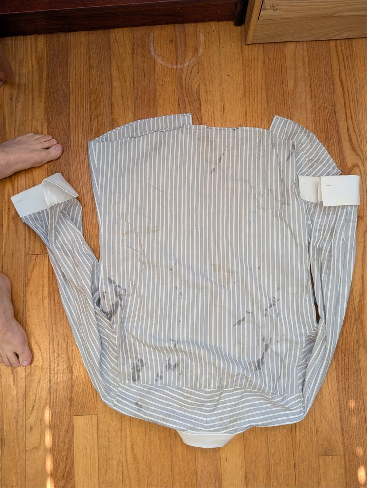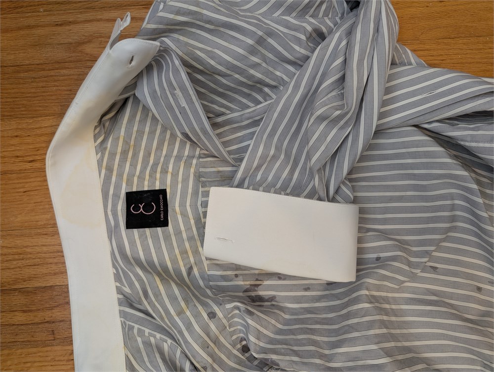 Carlo Chiocchio custom dress shirt, contrasting French cuff and tab collar, gray stripe.
