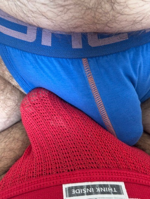 So we had a little fun, nothing too crazy, just some jockstrap play and a lot of teasing. The red one’s an XXL, the blue and orange are a large… and let’s just say, he knew exactly how to wear them right.